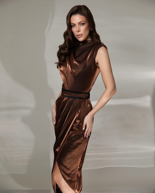 Metalik braon drapirana haljina od sjajnog materijala dužine do kolena sa pojasom.