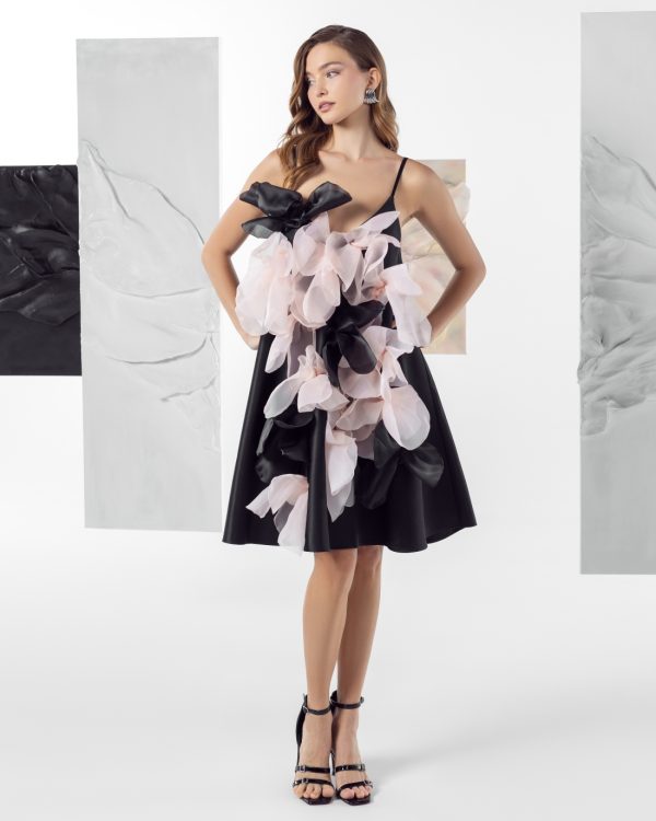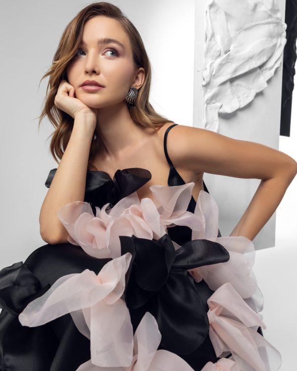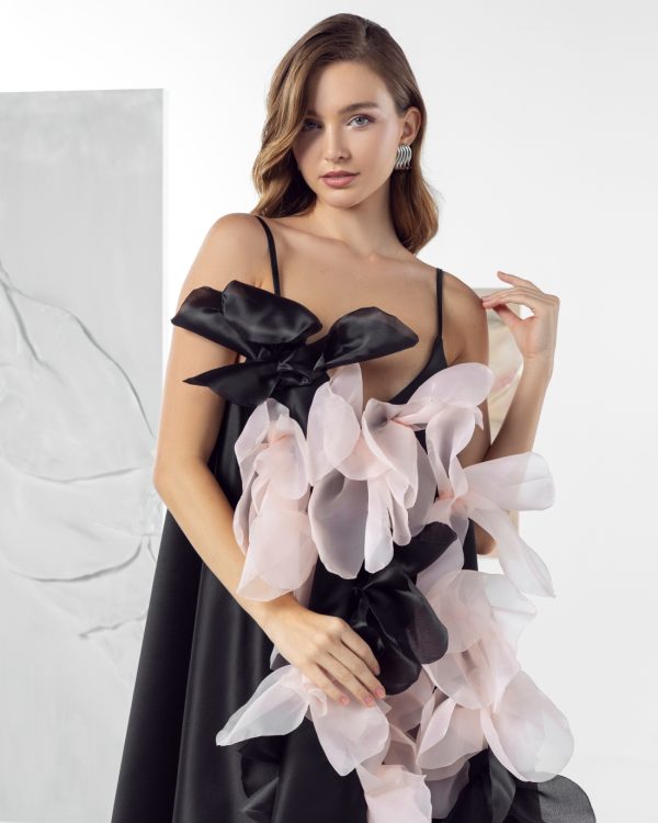 Haljinu krase upečatljivi ručno izrađeni cvetovi u nijansama roze i crne, dodavajući joj umetnički i glamurozan pečat.