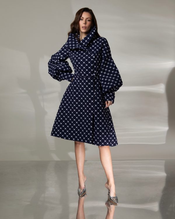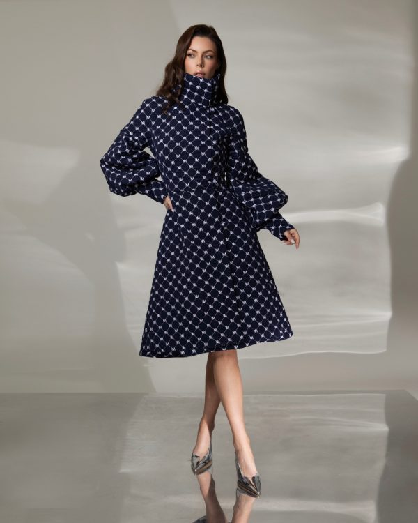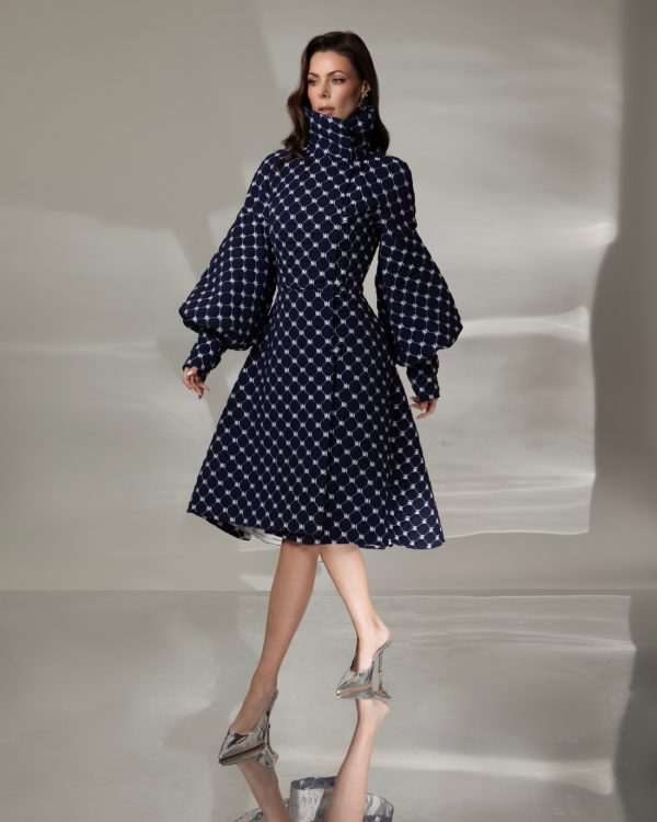 Tamnoplava osnova sa belim monogramskim vezom, visokom kragnom i puff predimenzioniranim rukavima.