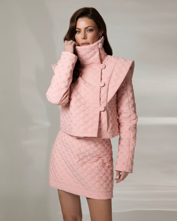 Gornji deo je izrađen od luksuzno prošivenog materijala sa visokom kragnom i oversized ramenima.