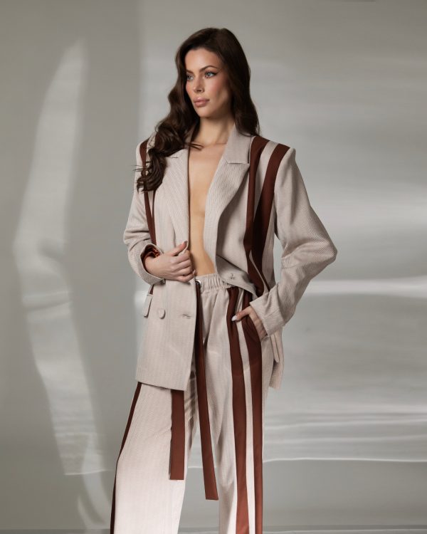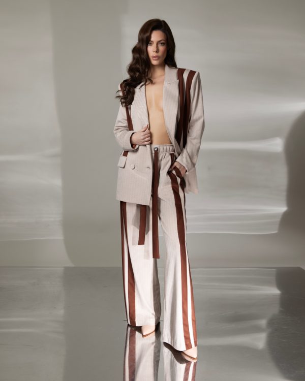 Bež podloga sa braon prugama stvara ritam koji vizuelno izdužuje figuru, dok oversized blejzer donosi dozu smelosti i senzualnosti.