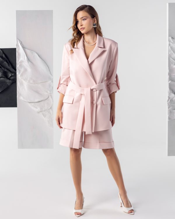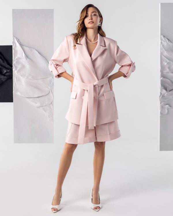 Blejzer sa pojasom i podvrnutim rukavima daje strukturu i eleganciju, dok bermude unose pokret i ženstvenost.