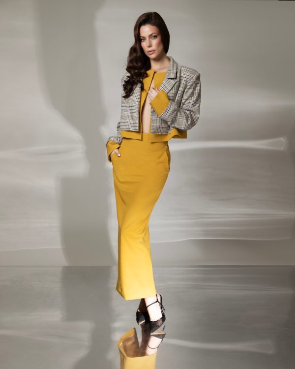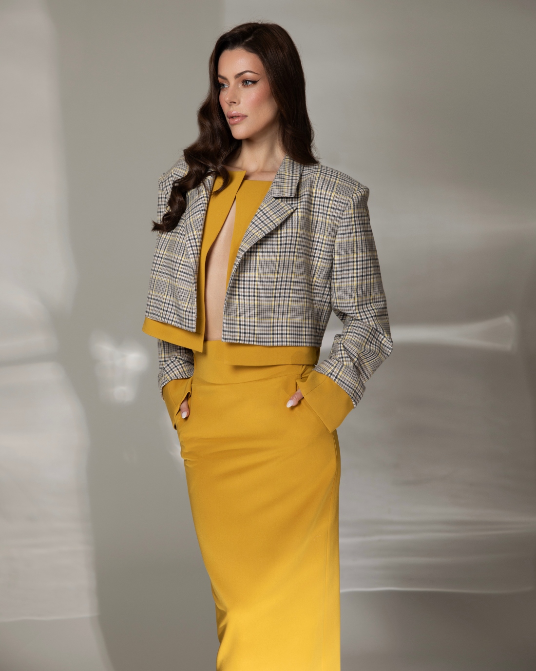 Strukturirani karirani sako sa širokim ramenima i mustard žutim detaljima donosi dozu samopouzdanja i sofisticiranosti, dok duga suknja pruža elegantan i jednostavan izgled.