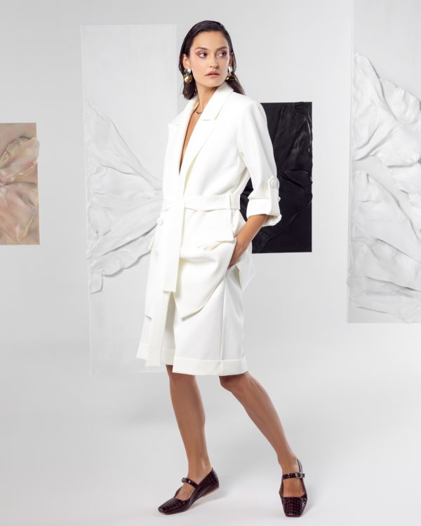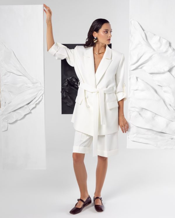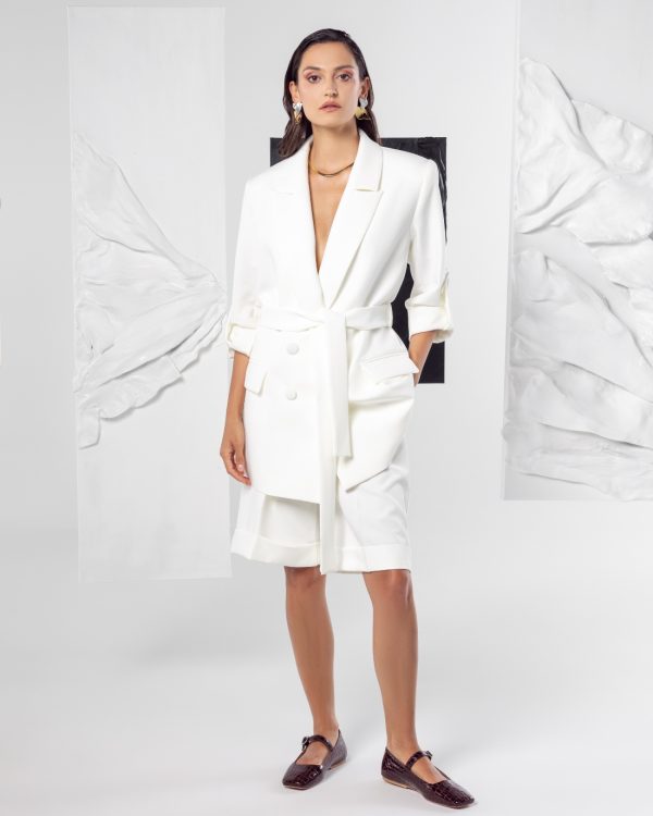 Komplet u beloj boji sastoji se od strukturiranog blejzera sa pojasom koji naglašava struk i bermuda dužine do kolena.